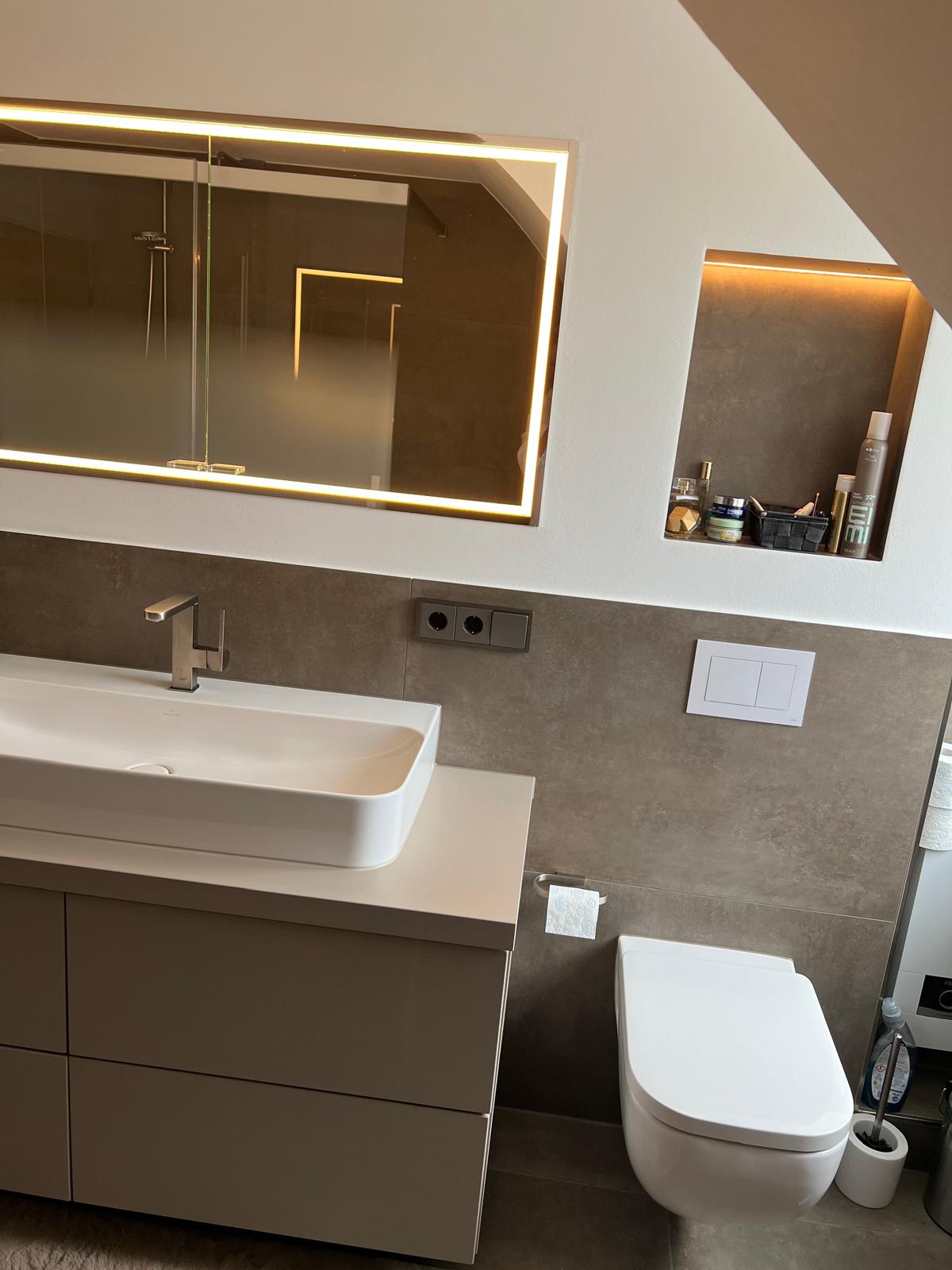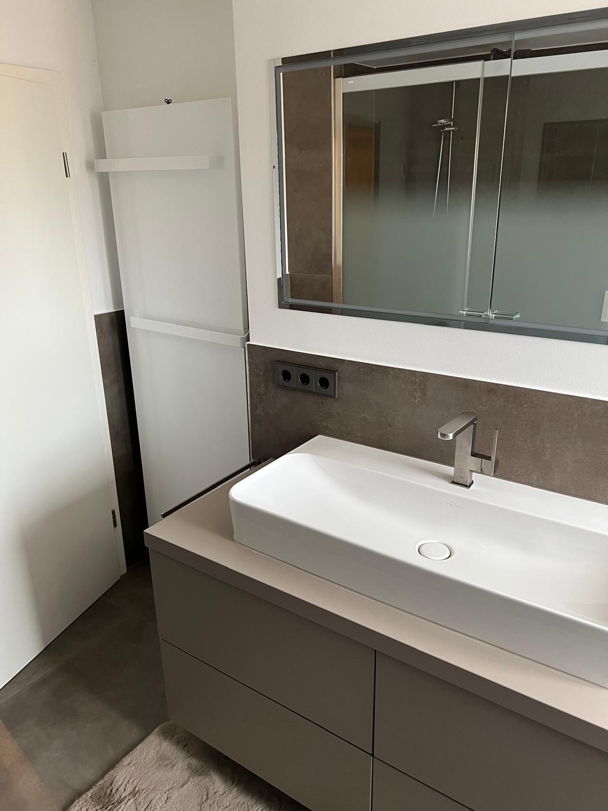 Der frühere Einzelwaschtisch wurde durch eine großzügige Waschtisch-Anlage mit viel Stauraum und einem Spiegelschrank mit integrierter LED-Beleuchtung ersetzt – funktional, hell und stilvoll zugleich.