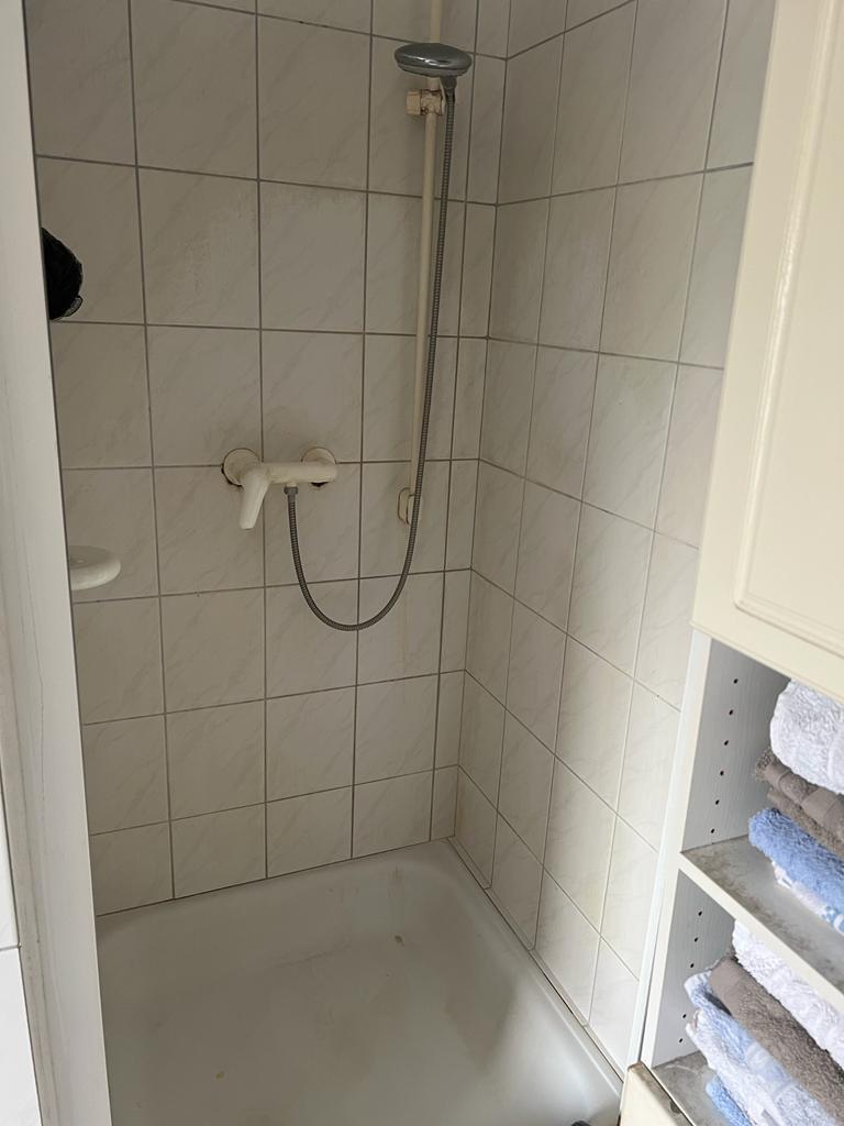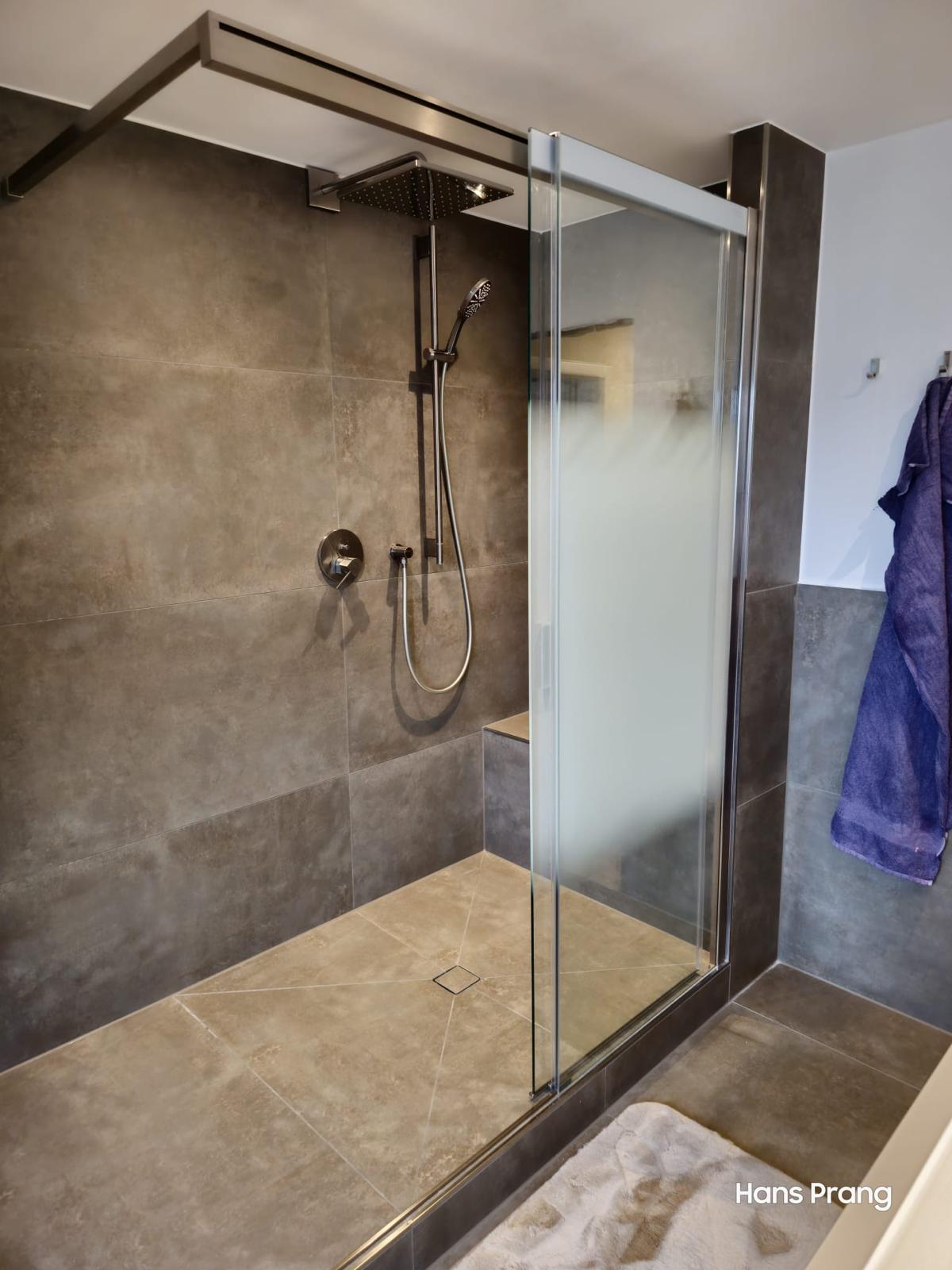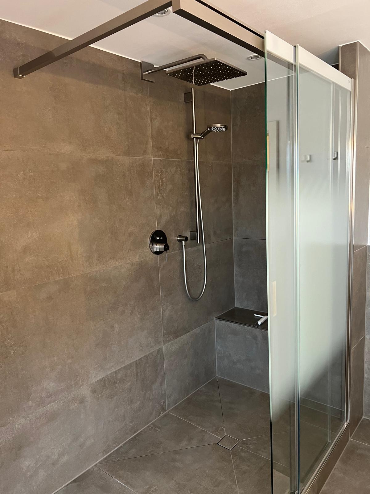 Aus der alten Badewanne und der separaten Dusche entstand eine großzügige Dusche mit Regenschauer-Funktion, die modernen Komfort und klares Design vereint. Unser Fliesenleger integrierte im Duschbereich eine praktische Sitzbank, die zusätzlichen Komfort und Sicherheit bietet.