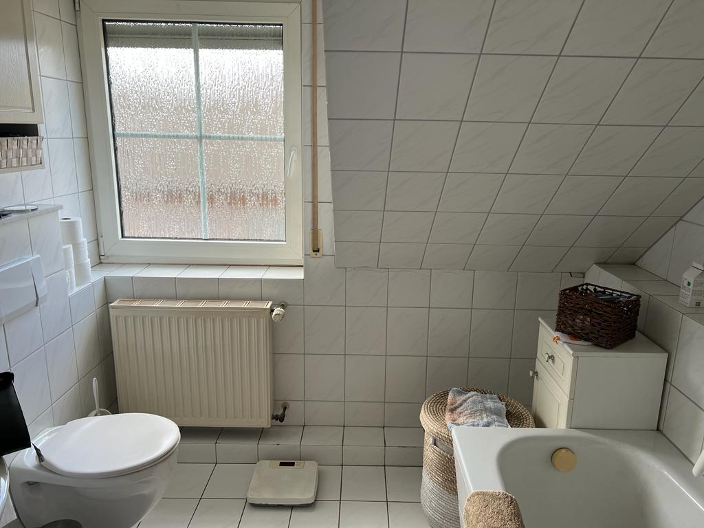 Auch beim Thema Wärme und Design wurde Wert auf Qualität gelegt: Der alte Heizkörper wich einem modernen Badheizkörper mit Handtuchhaltern, der für angenehme Wärme und Ordnung sorgt. Eine spülrandlose WC-Anlage ergänzt das neue Gesamtbild hygienisch und pflegeleicht.