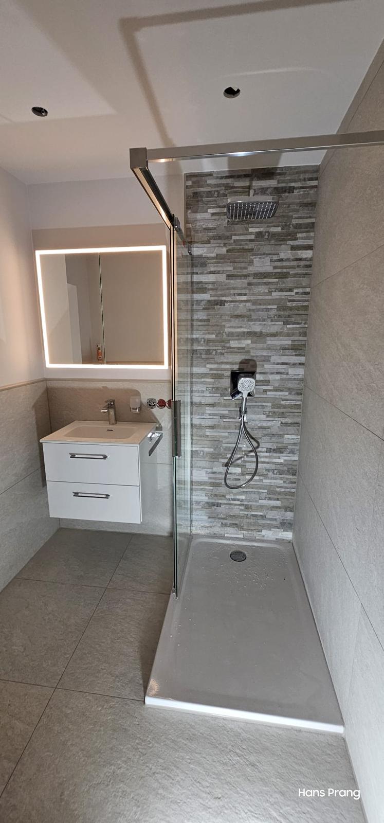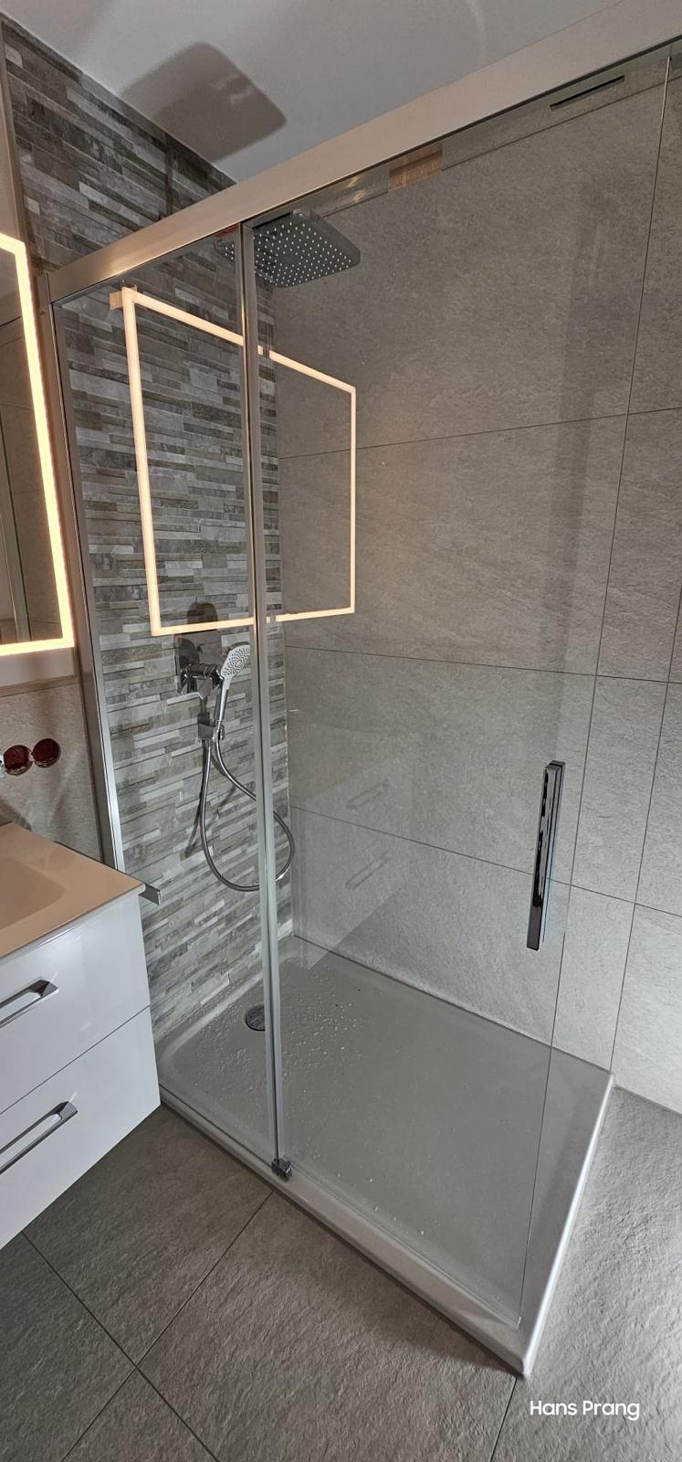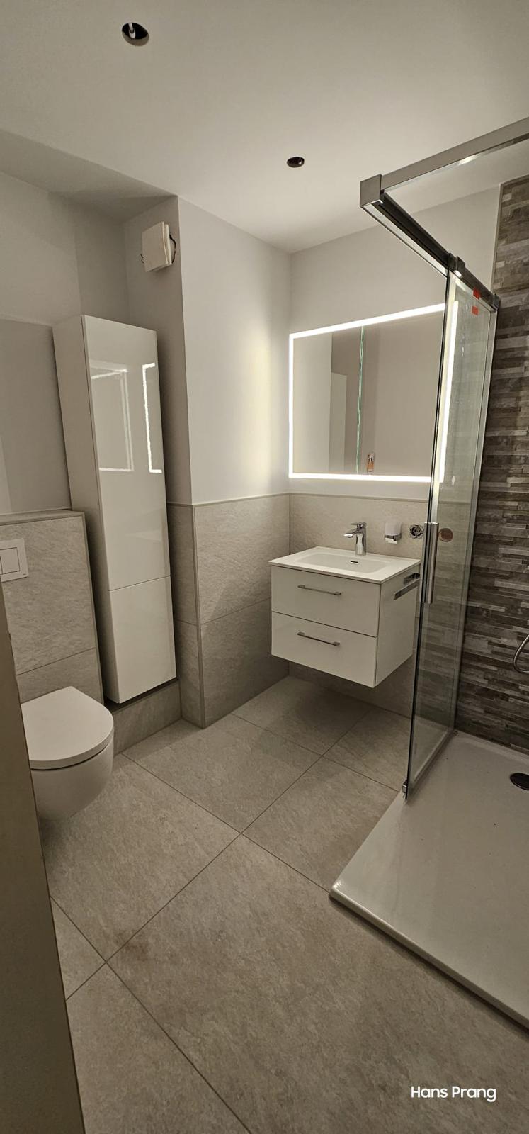 In diesem Altbau in 50126 Bergheim wurde das bestehende Badezimmer vollständig modernisiert und barrierefrei gestaltet. Die alte Wanne wurde gegen eine moderne Dusche mit Glasschiebetür und integrierter weißer Duschwanne ersetzt, wodurch der Einstieg nun besonders komfortabel ist. Ein neuer Waschtisch, ein wandhängendes WC und ein Spiegel mit LED-Rahmen runden die Ausstattung ab und sorgen für ein zeitgemäßes, funktionales Badambiente.