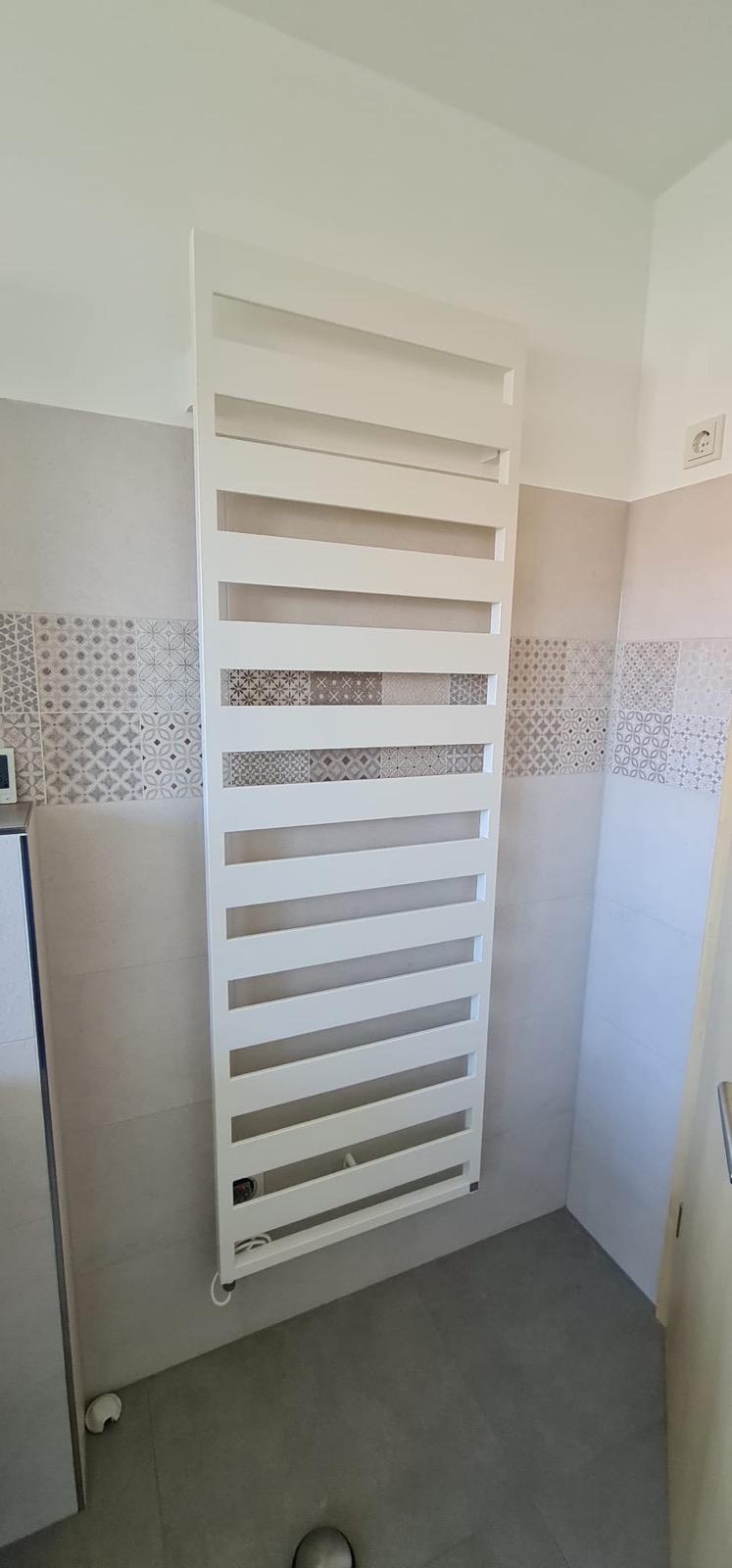 Das neue Bad bietet viel Stauraum, eine moderne Dusche, eine komfortable Badewanne sowie einen großzügigen Waschtisch mit Spiegel und indirekter Beleuchtung. Ein designorientierter Heizkörper rundet das Gesamtkonzept perfekt ab.