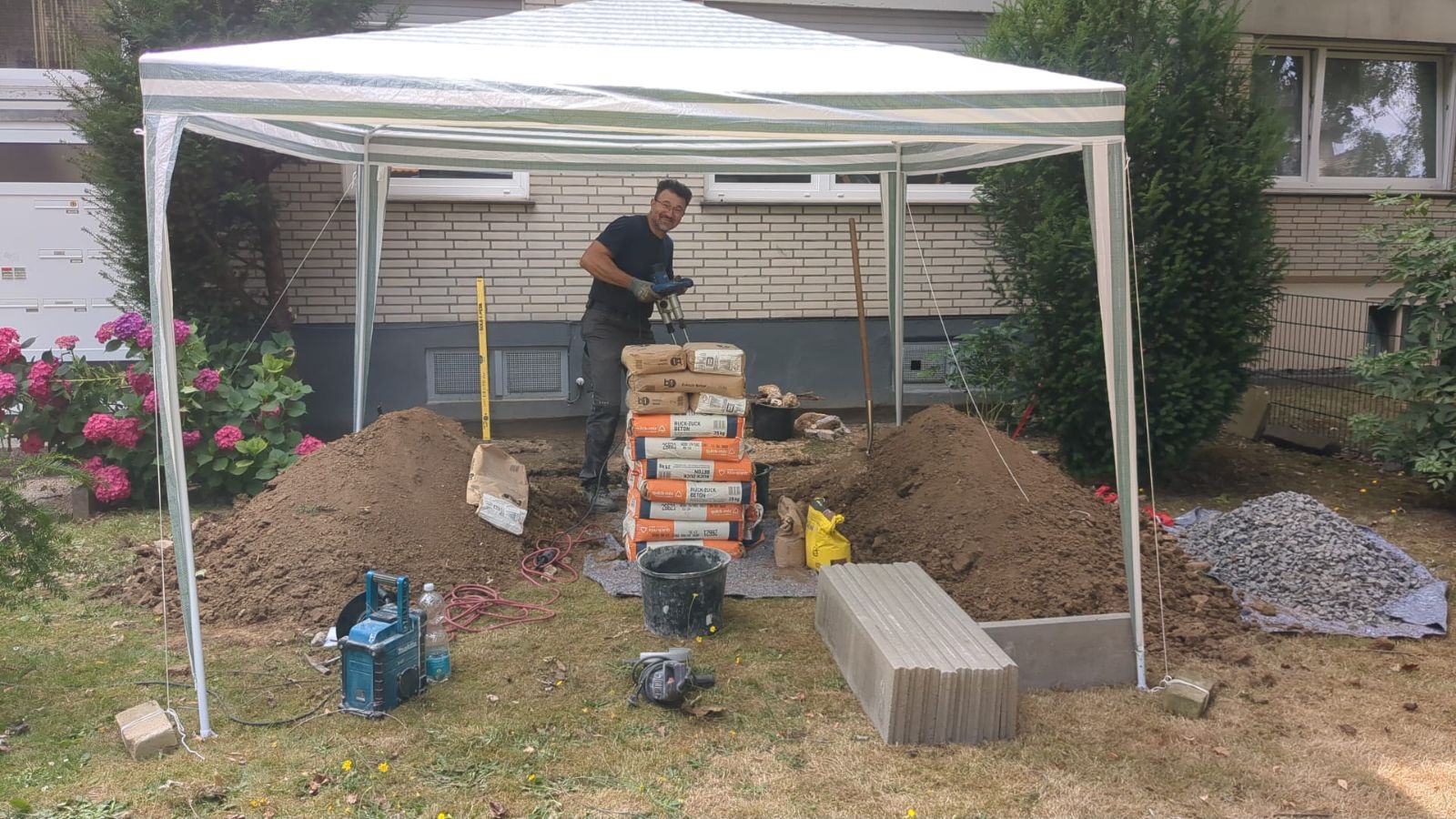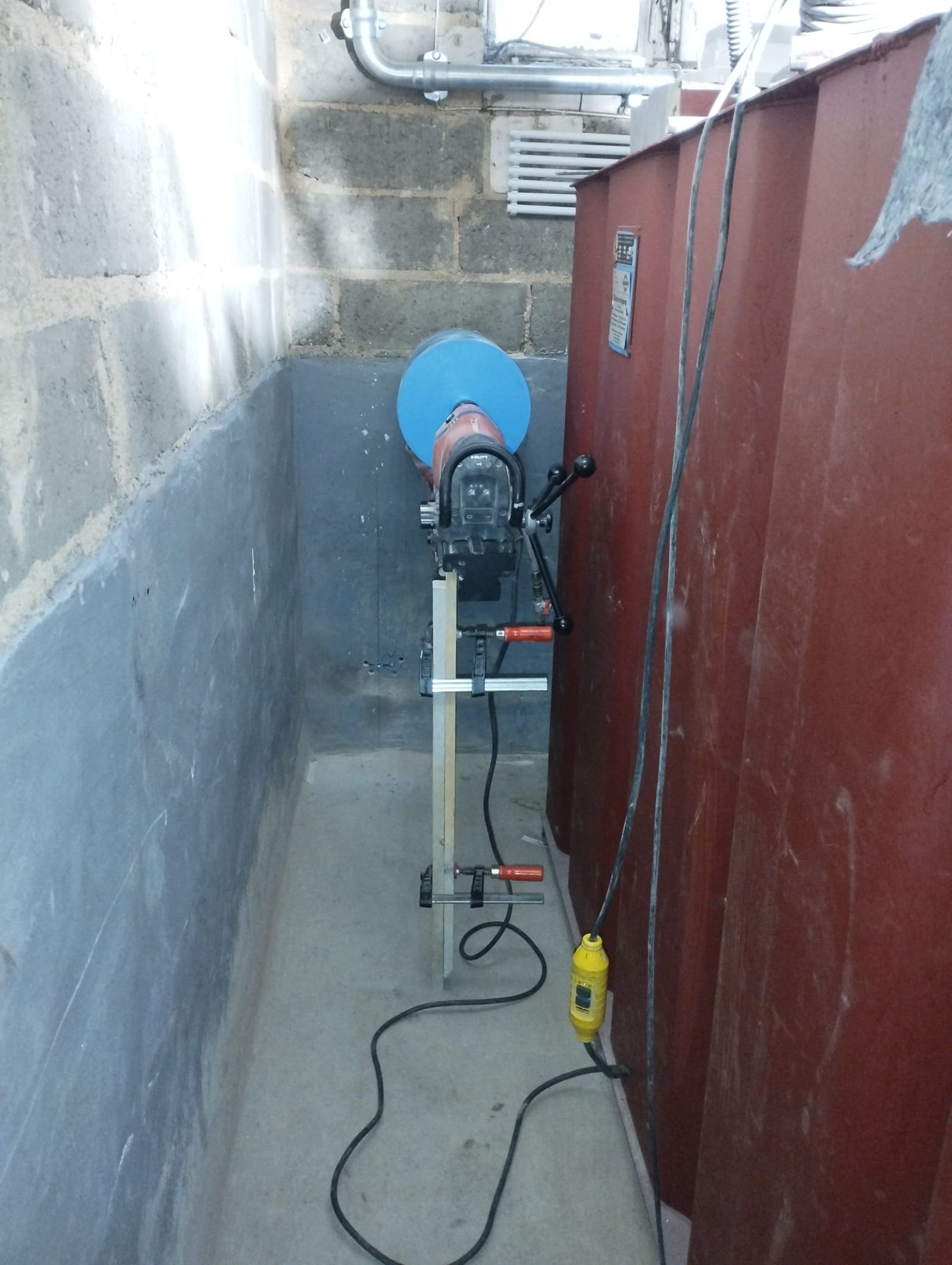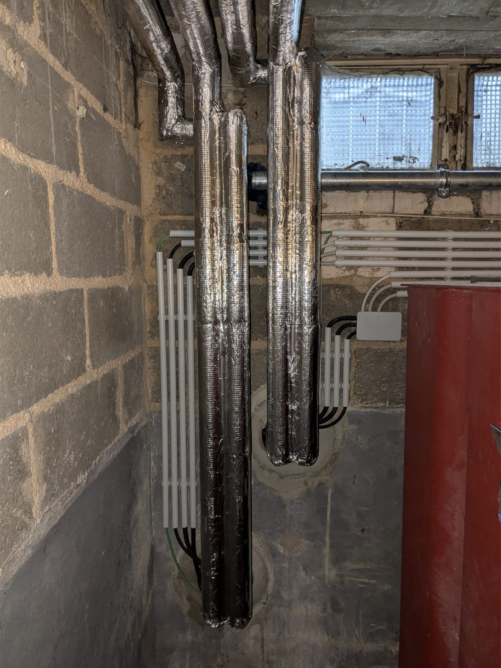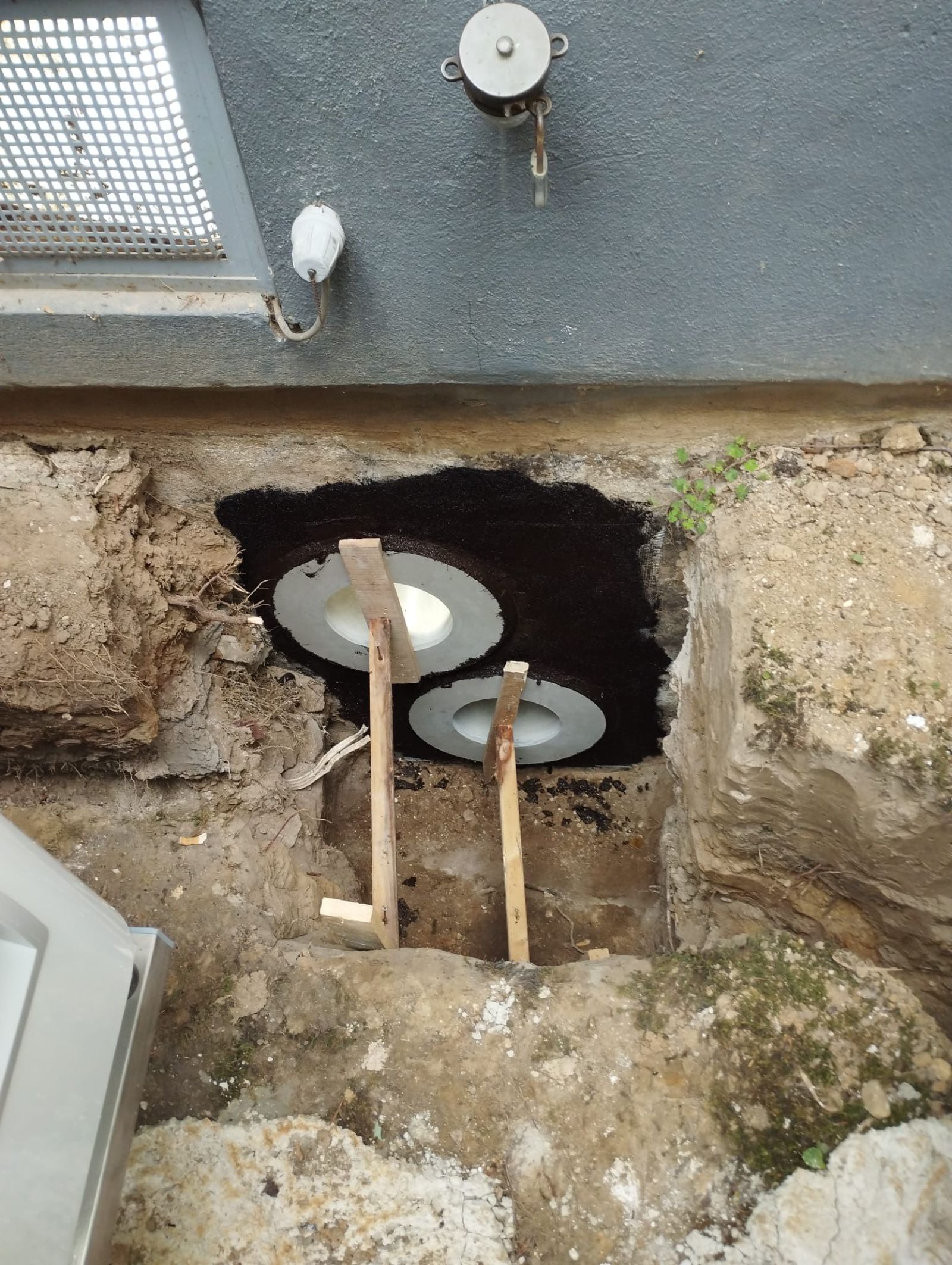 Auch der Außenbereich wurde mit viel Liebe zum Detail umgesetzt: Die beiden Außeneinheiten stehen stabil auf Edelstahlfüßen, eingerahmt von Basaltsteinen. Die Kernbohrungen und Mauerdurchführungen wurden fachgerecht abgedichtet – auch gegen drückendes Wasser – und vollständig durch unser Team ausgeführt.